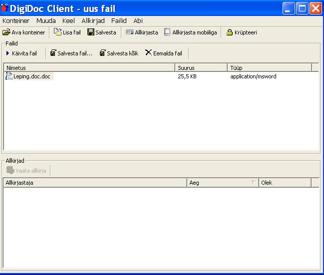 Teisel juhul võid programmi käsitsi käivitada (Start > Programs > DigiDoc > DigiDoc Client) ning konteinerisse failid lisada. Selleks klõpsa DigiDoc klientprogrammi menüüs nuppu Lisa fail ja leia oma kettalt failid, mida allkirjastada soovid. Peale seda, kui oled kõik soovitud failid lisanud, klõpsa nuppu "Allkirjasta".